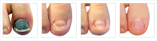 Terapia: W pierwszym etapie dokładnie usunięto odklejony fragment paznokcia. Pod nim widoczna była rozległa rana, z której sączyła się krew. W kolejnym etapie została ona zabezpieczona opatrunkiem ze srebrem. Na opatrunek zastosowano odciążenie z gąbki do tamponady, co miało zapewnić amortyzację ucisku obuwia. W trakcie kolejnych wizyt tor wzrostu odrastającej płytki był korygowany przy użyciu systemu korekcji, oczyszczano również fragmenty, które odwarstwiały się w procesie regeneracji. Stosowana była też zalecona przez podologa pielęgnacja domowa.