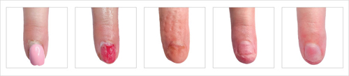 Terapia: W pierwszym etapie usunięto stylizację, a następnie zerwany paznokieć. W kolejnym etapie rana powstała na skutek urazu została zaopatrzona opatrunkiem ze srebrem, na który zaaplikowano preparat z kolagenem i rumiankiem. Podczas kolejnych wizyt oczyszczane były wszelkie odklejające się fragmenty paznokcia, co w procesie regeneracji jest naturalnym zjawiskiem. Oczyszczanie powtarzano aż do pełnej regeneracji płytki paznokcia. Pacjentka stosowała też zaleconą pielęgnację domową.